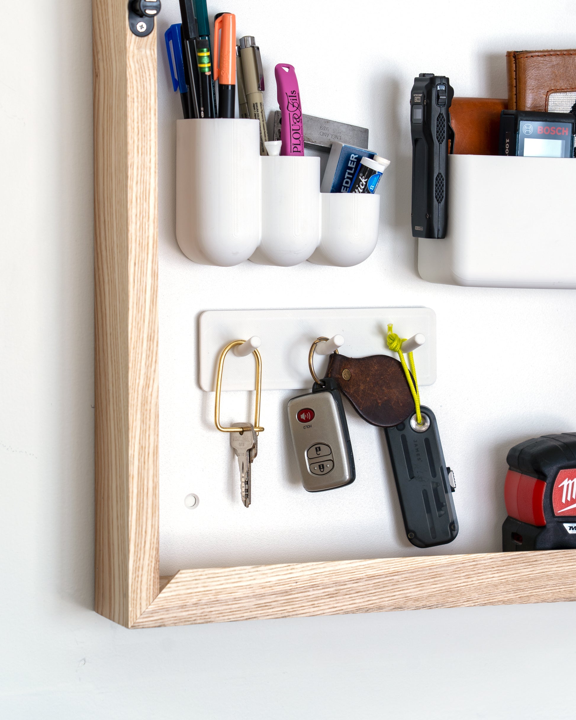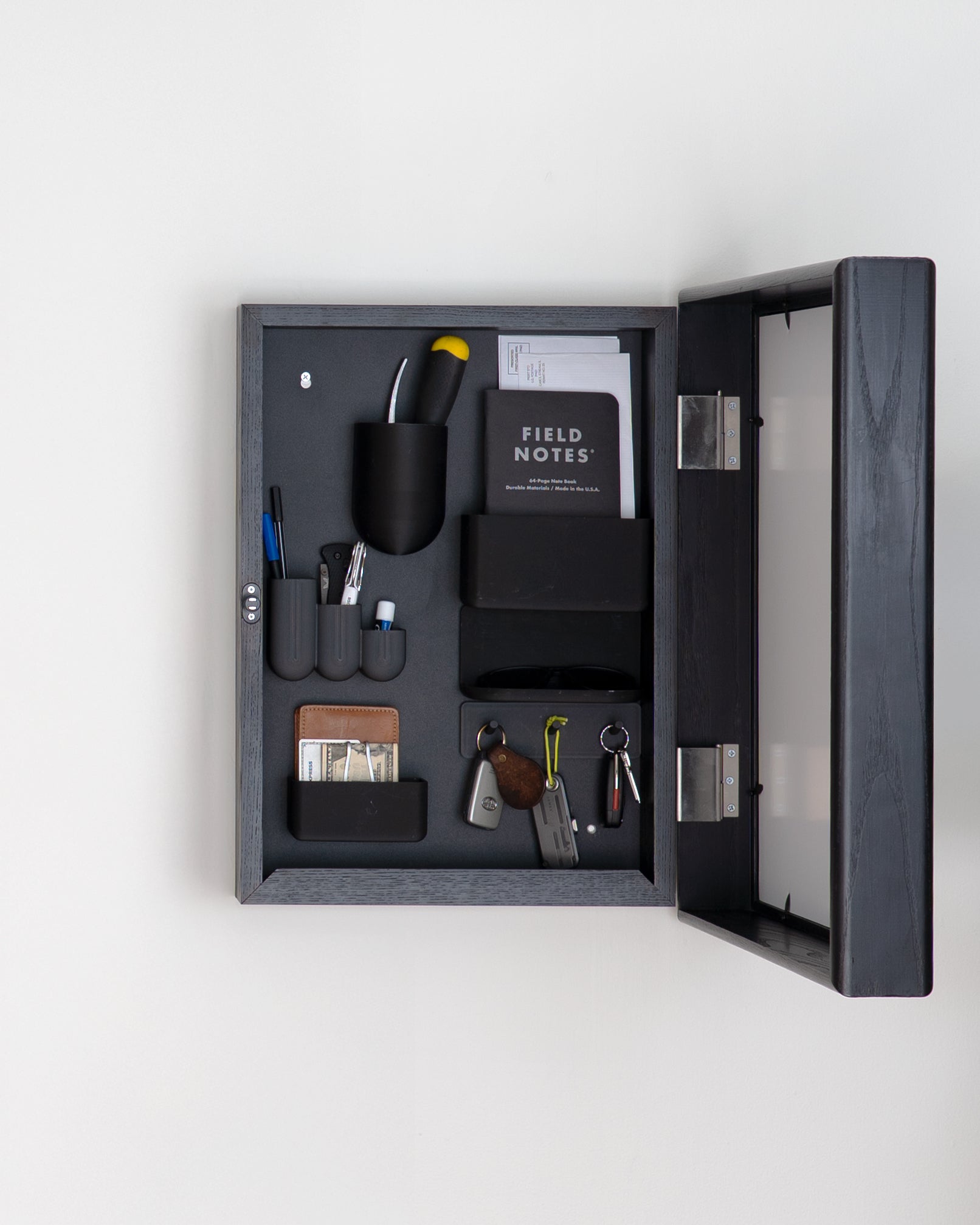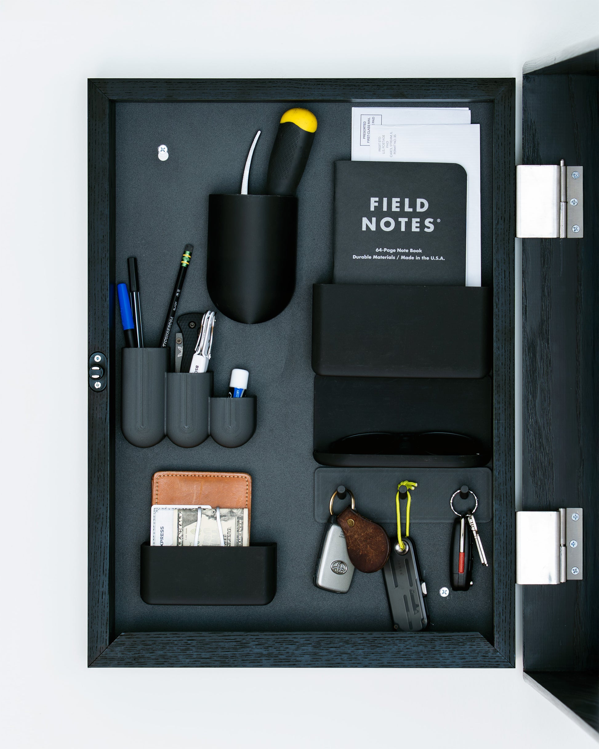The Medium Stash Frame includes six magnetic organizers, each designed in house and available exclusively with Stash. Each specially designed to hold your everyday essentials like keys, wallet, or sunglasses, while also stashing entryway items such as mail, cards, or chargers—the things that used to clutter your counters.