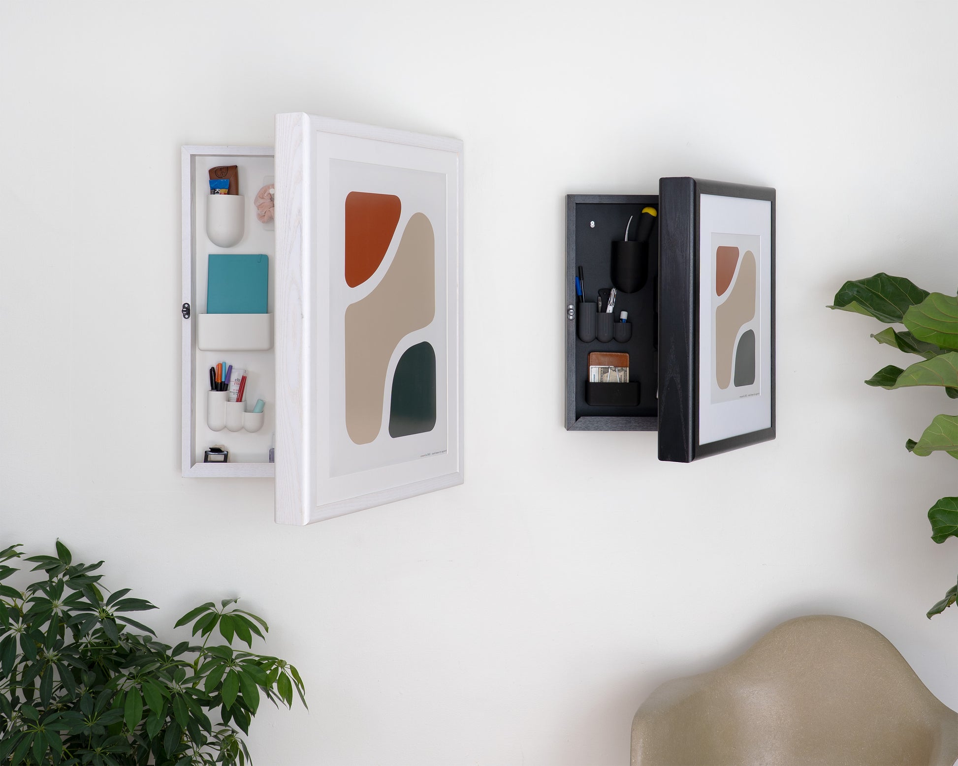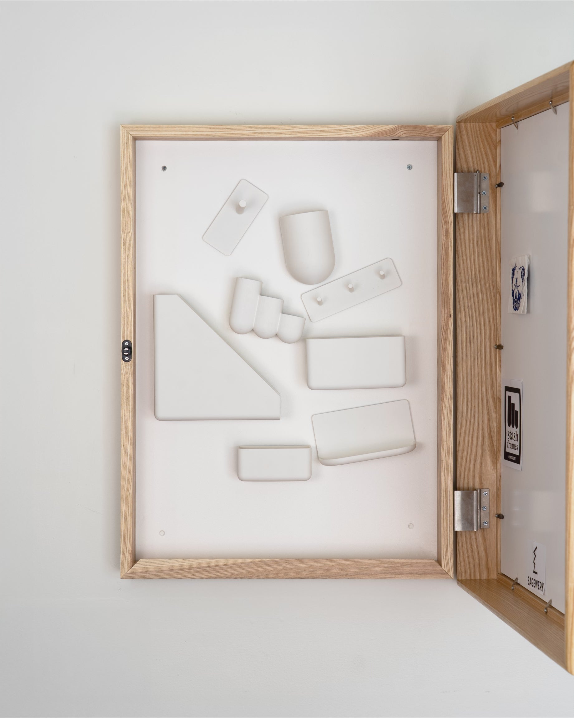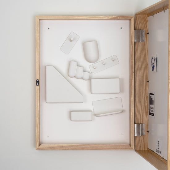 Handcrafted from FSC-certified American ash, Stash blends seamlessly into your home. It looks like framed art. With the push of a finger, an invisible push-to-open latch and our patent-pending hinge reveal a cabinet with a modular organization system inside.
